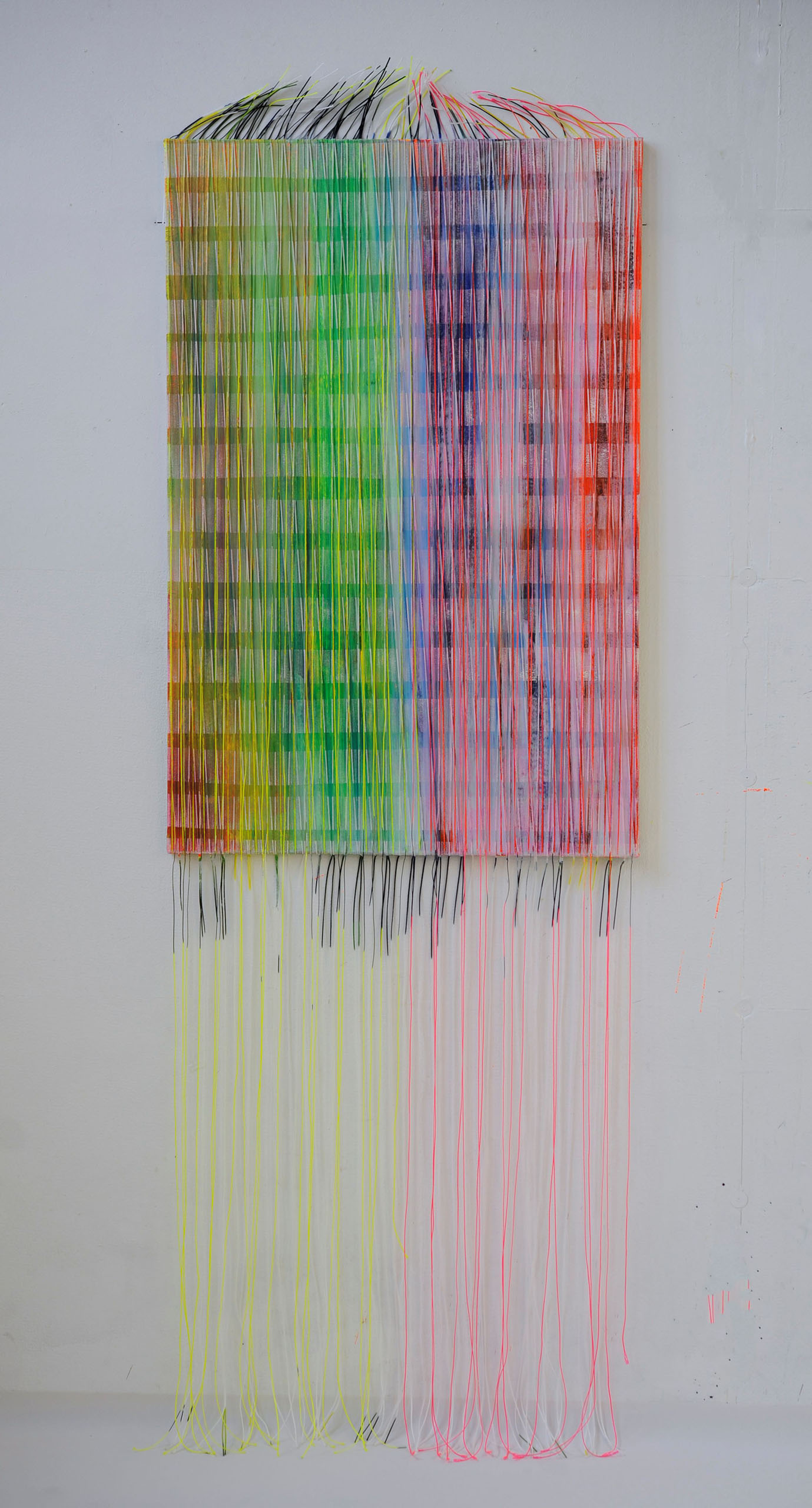 White Light, 2025, Öl, Acryl, Maurerschnur auf Leinwand, 235x80cm (Rahmen 120x80cm)