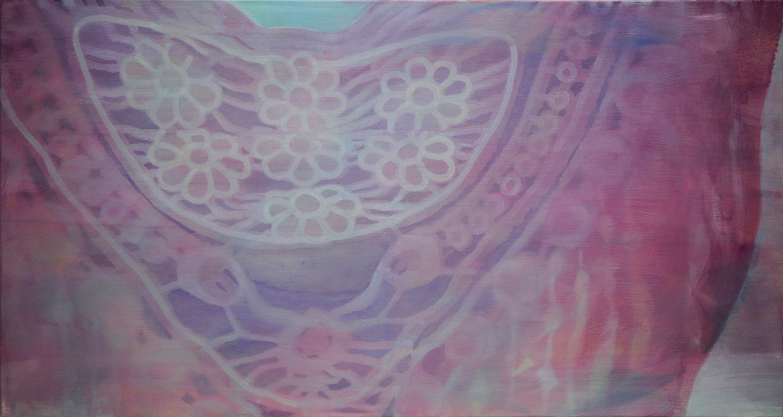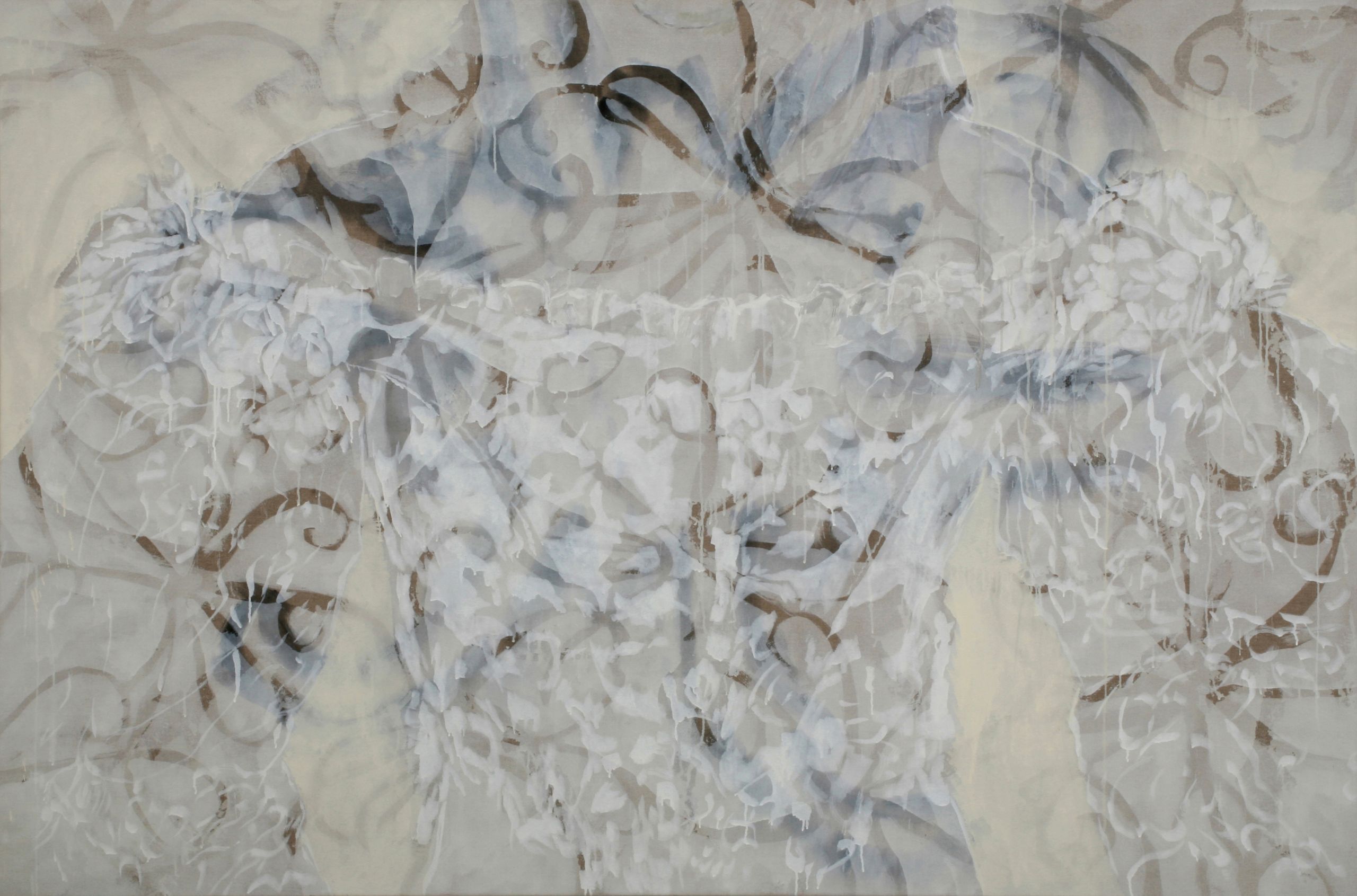 Spitzenoberteil, 2005, Acryl, Tusche auf ungrundierter Leinwand, 161x243cm