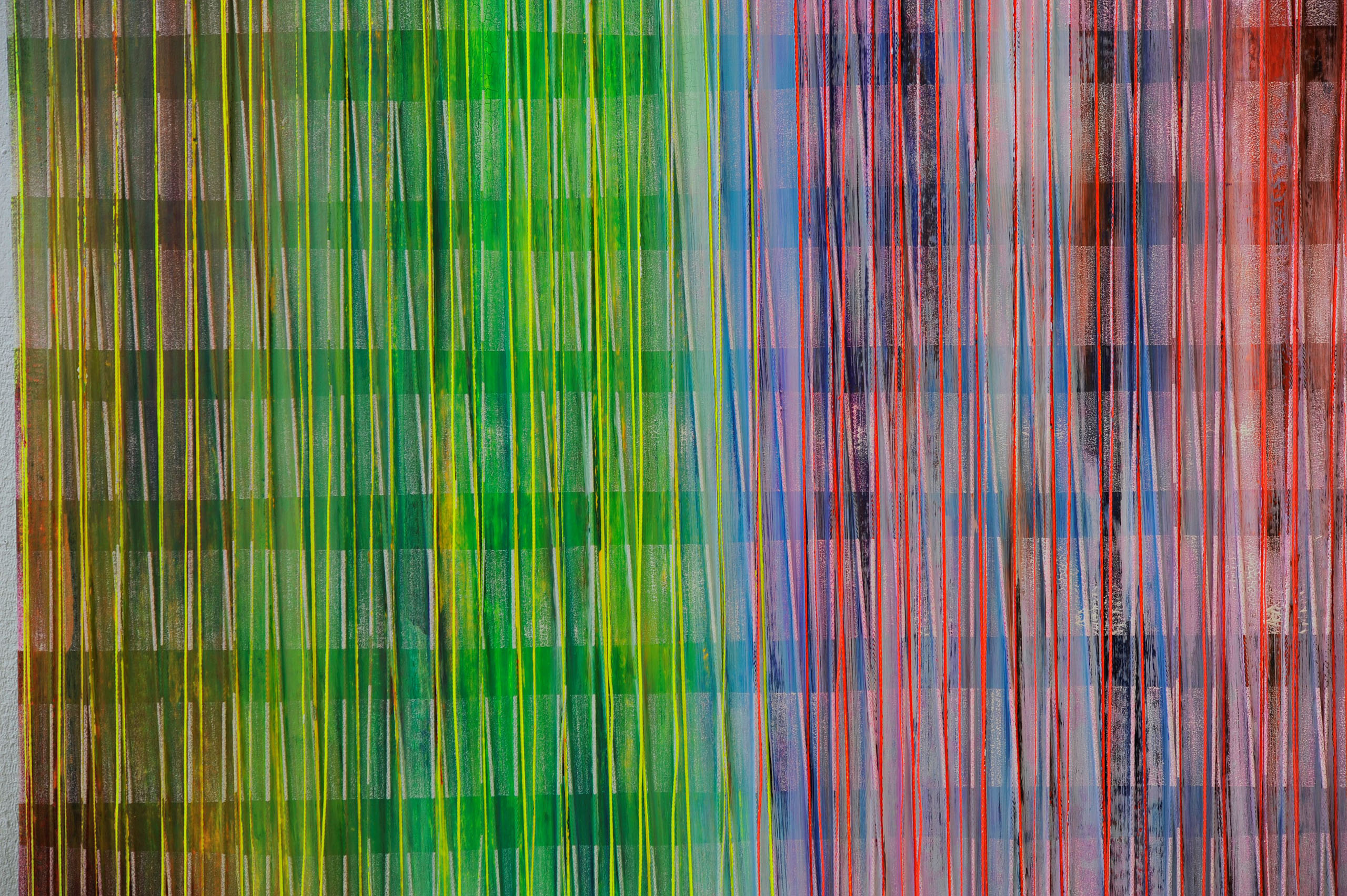 White Light, 2025, Öl, Acryl, Maurerschnur auf Leinwand, 235x80cm (Rahmen 120x80cm)