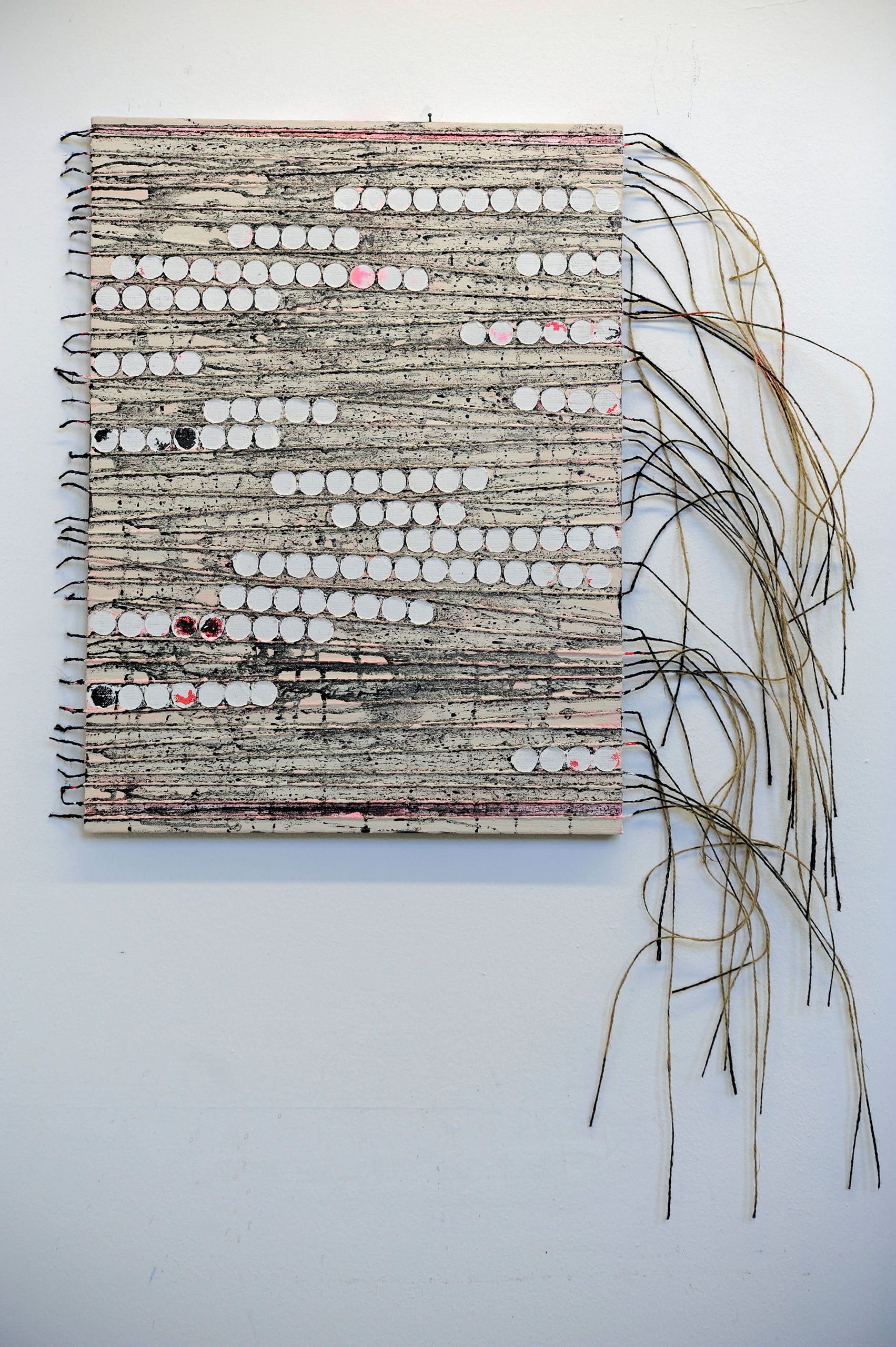 o.T., 2024, Öl, Tusche, Sisalschnur auf Leinwand, ca.100x75cm (Rahmen 66x49cm)
